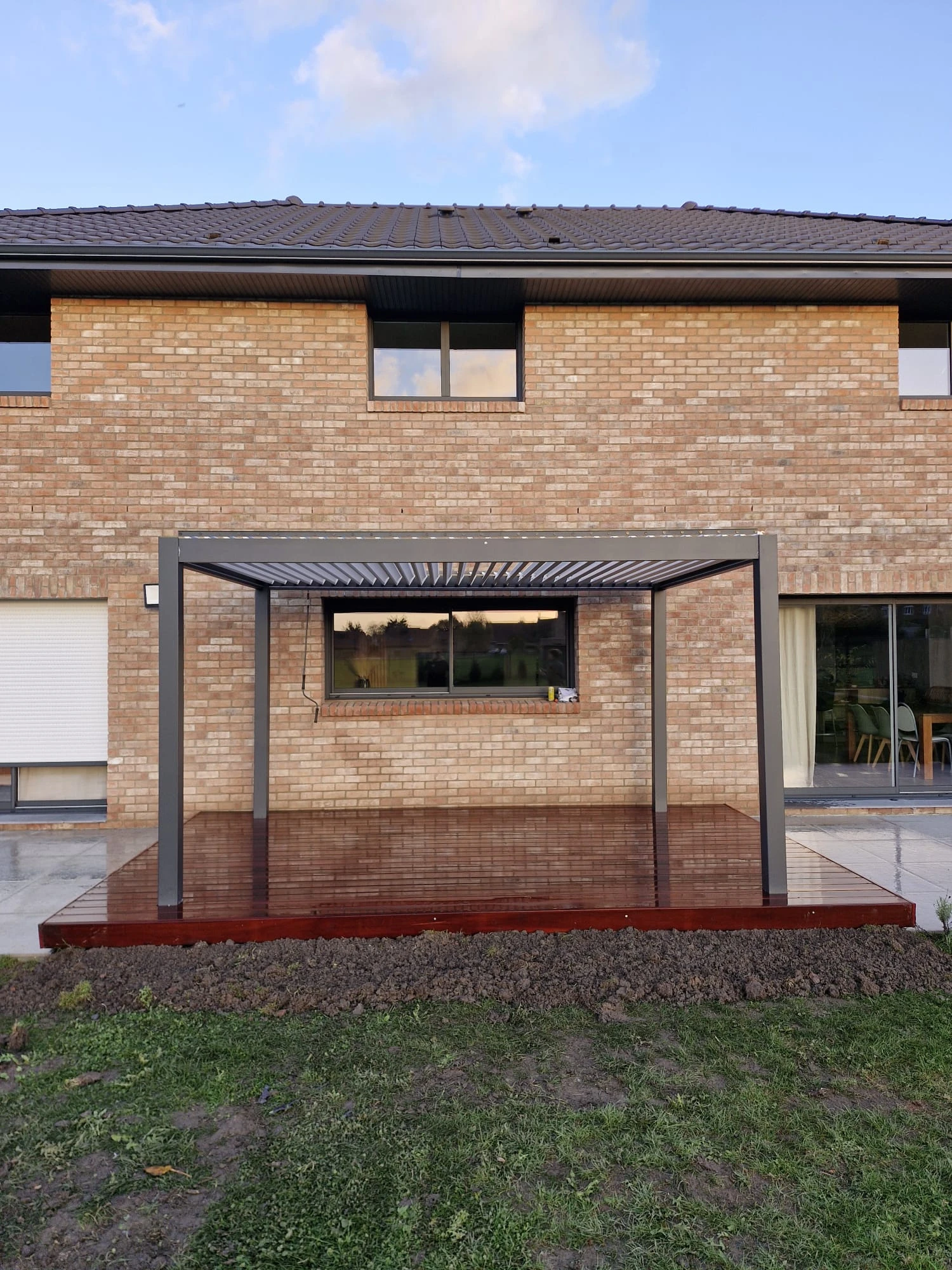En complément, nous avons assuré la pose d’une pergola bioclimatique gris anthracite, parfaitement intégrée à la terrasse. Ce type de pergola permet une gestion optimale de l’ensoleillement et de la ventilation, offrant un confort d’utilisation tout au long de l’année. Sa teinte gris anthracite apporte une touche moderne et élégante, en parfaite harmonie avec le bois exotique.